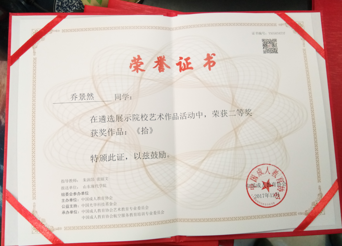 乔景然同学,在遴选展示院校艺术作品活动中,荣获二等奖。获奖作品:《拾》