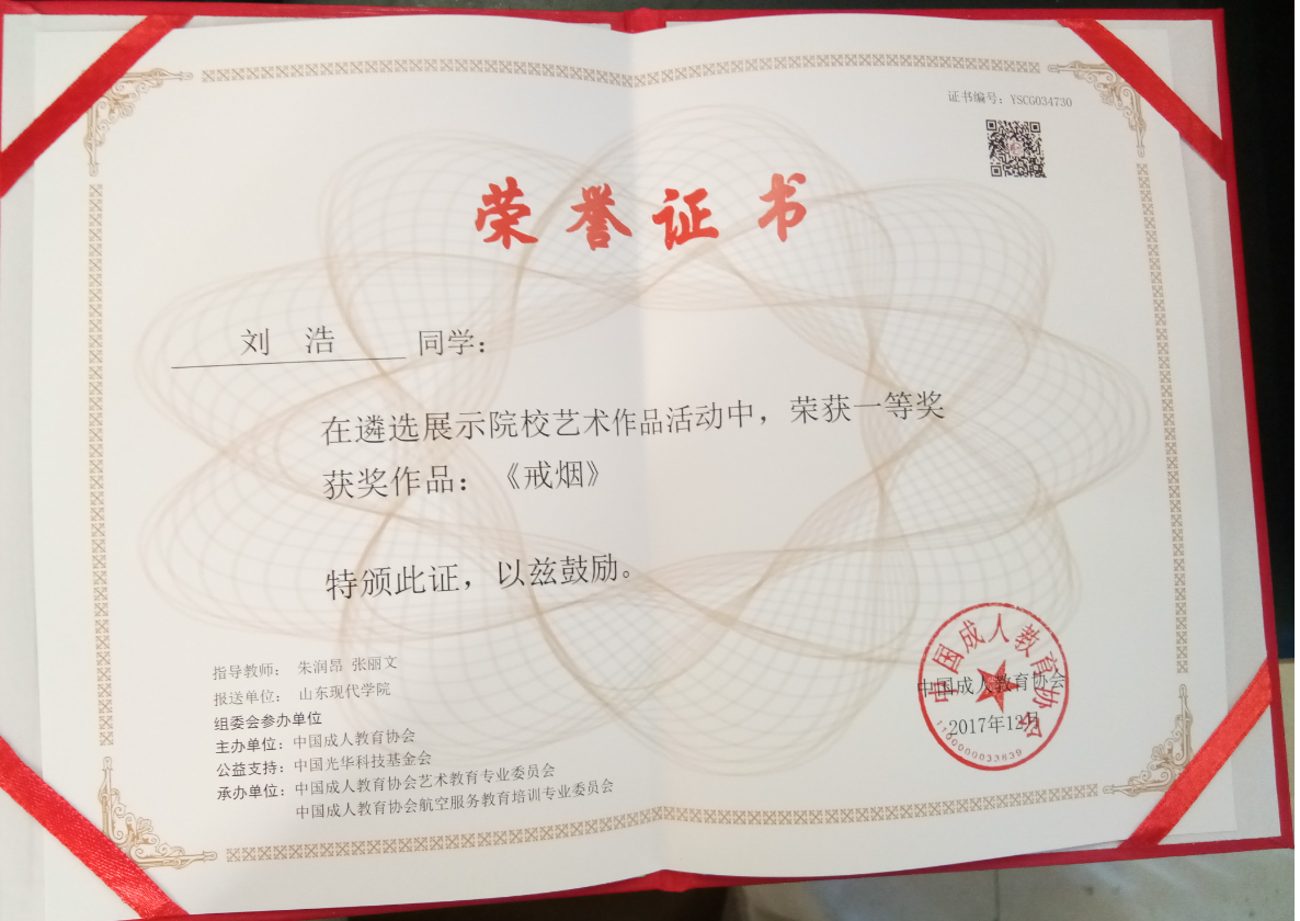 刘浩同学,在遴选展示院校艺术作品活动中,荣获一等奖。获奖作品:《戒烟》