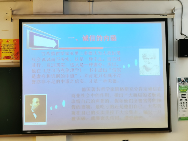 会议伊始,老师先为同学们介绍了诚信的含义,其本意是“诚实守信”,并赞扬了“诚实守信”即是中国的传统美德,也彰显人的高尚品质,从古代的孔子、老子到党的十八大所提出的社会主义核心价值观中提到的诚信再到国外的亚里士多德、恩格斯,诚信贯穿着整个古今中外。