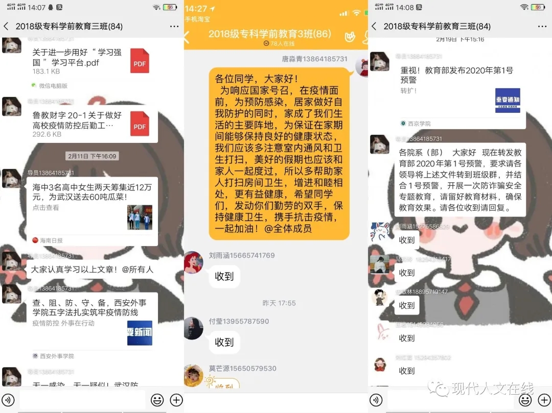 人文学院的导员和老师们都十分关注同学身体健康情况,积极通知学生们如何进行疫情防控,及时做好健康卫生教育,学习卫生健康的任务落实到每一位同学。同学们积极配合老师,在家进行体育锻炼,并做好疾病预防,大家一起齐心协力,共同抗击疫情。