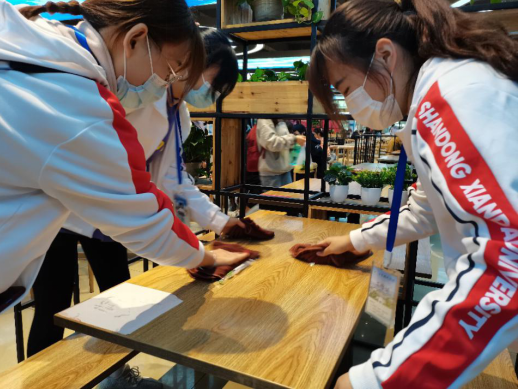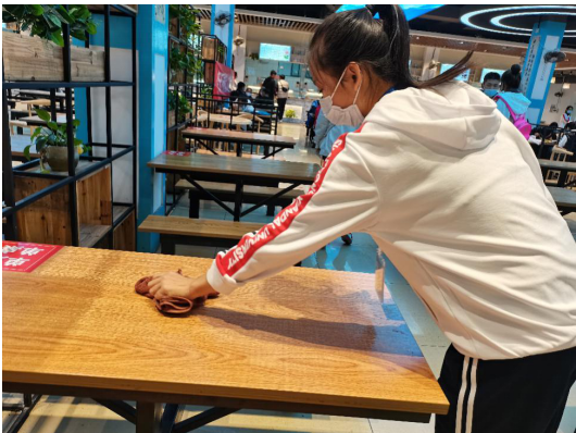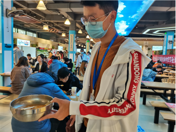 志愿者们不怕脏也不怕累,井然有序的进行着餐盘回收工作,也为后续的餐厅工作提供了极大的便利。即使是餐盘上的剩饭油污也没能阻止志愿者们的工作热情。并在同学们就餐完毕后认真擦桌子,将饭桌上的饭粒、残渣收拾干净,为下一位吃饭的同学提供干净的桌椅。一举一动无处不展现着现代学子的文明素养。