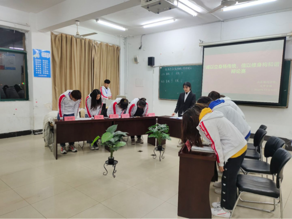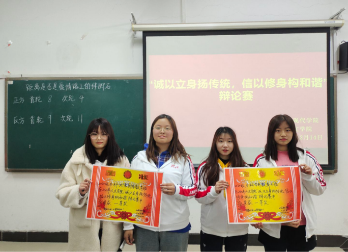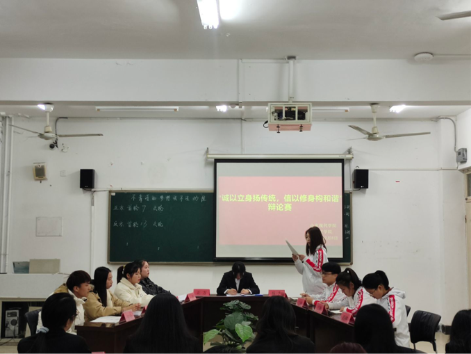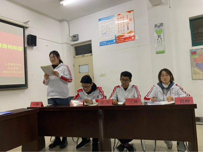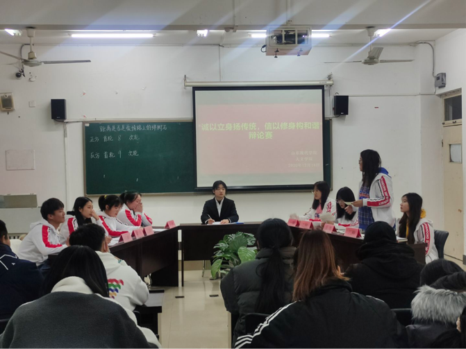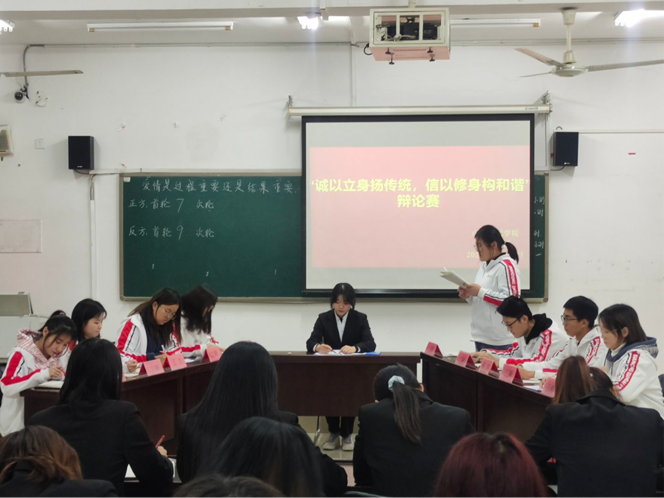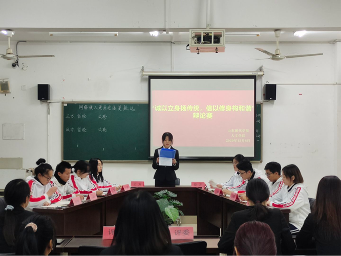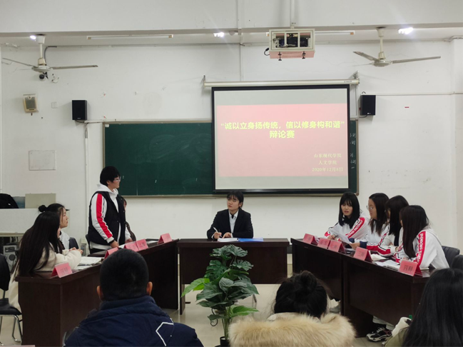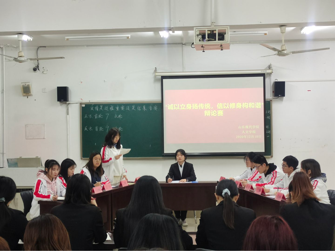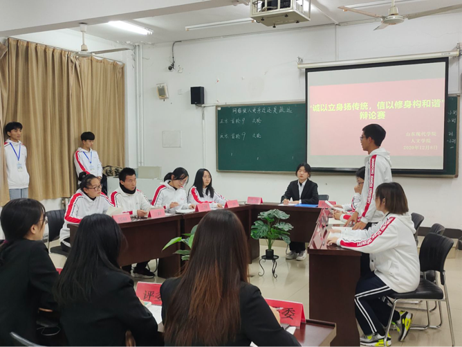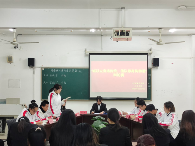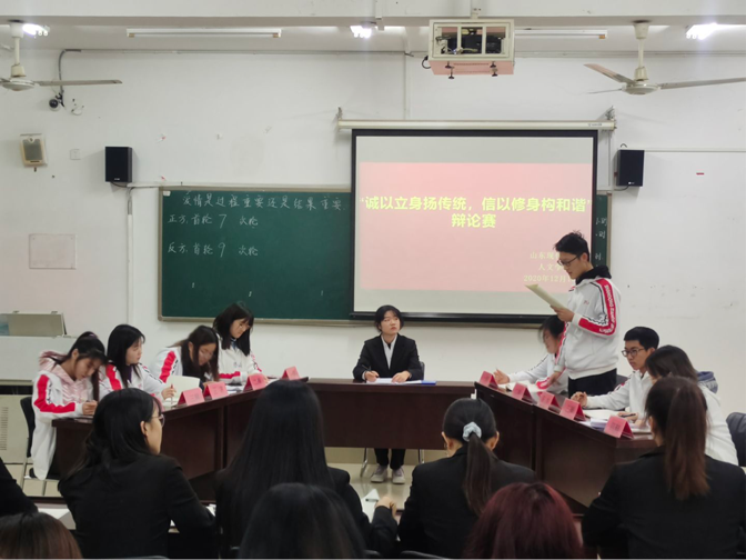 为丰富人文学院学生的校园生活,活跃校园气氛,促进学生全面发展,提高学生的辩论演讲能力、语言组织能力、逻辑思维能力等。2020年12月8日至14日,人文学院在知敬楼412教室举办以“诚以立身扬传统,信以修身构和谐”为主题的辩论赛。