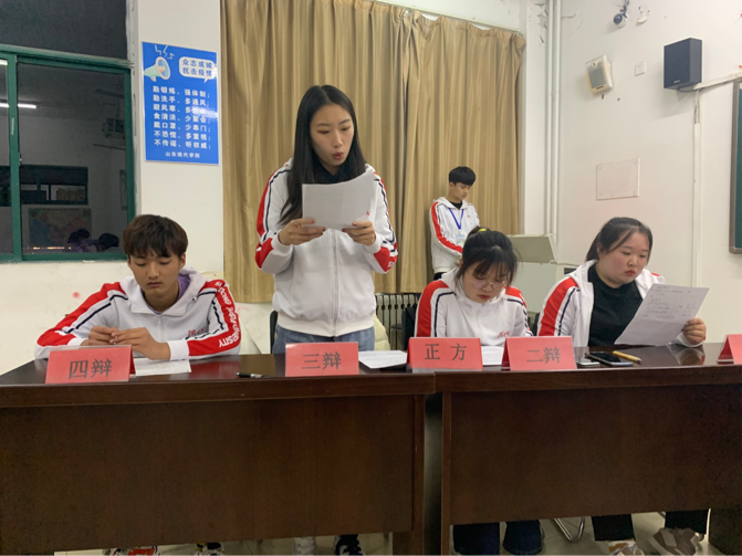 比赛开始前由体育部马玮同学介绍比赛规则,比赛双方陈述观点,在一辩中,正反方攻辩,各方辩手有三分钟的表达时间。随后中场休息五分钟,然后进行二辩,在二辩中,双方自由辩论,接着对己方观点进行总结。各评委对双方辩手进行提问,最后以举手表决。
