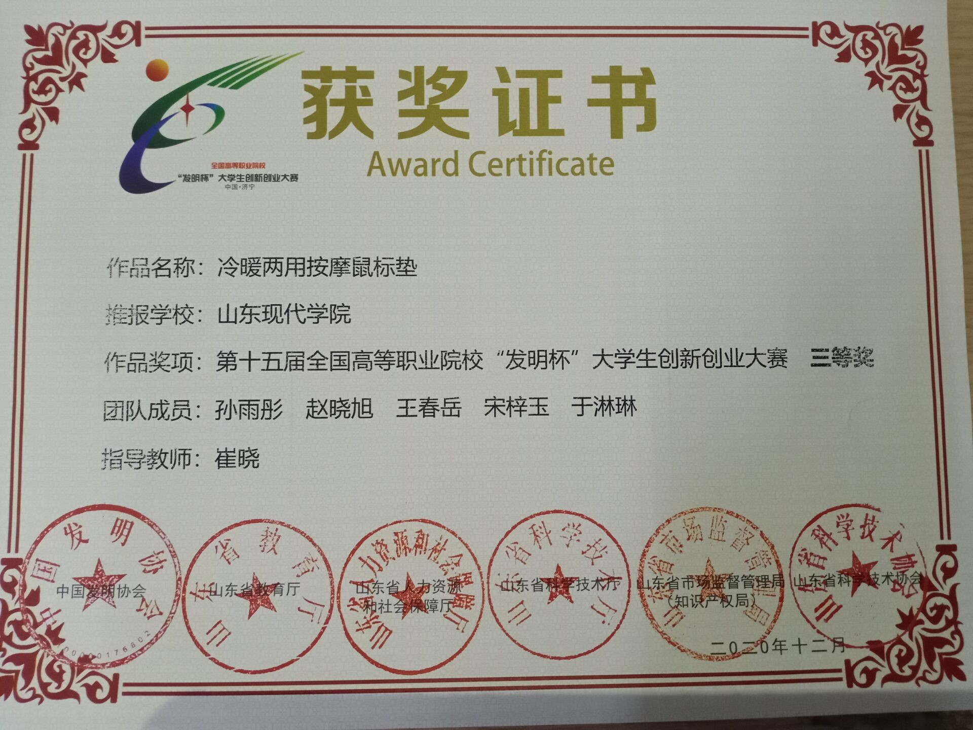作品名称:冷暖两用按摩鼠标垫 作品奖项:第十五届全国高等职业院校“发明杯”大学生创新创业大赛三等奖 团队成员:孙雨彤、赵晓旭、王春岳、宋梓玉、于淋琳 指导教师:崔晓