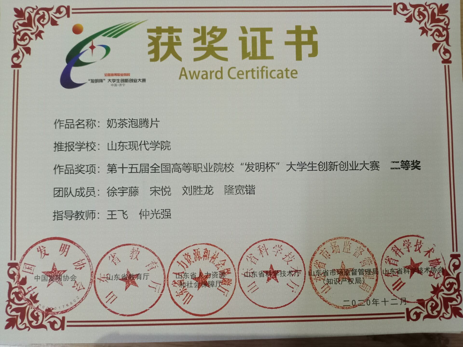 作品名称:奶茶泡腾片 推报学校:山东现代学院 作品奖项:第十五届全国高等职业院校“发明杯”大学生创新创业大赛二等奖 团队成员:徐宇藤、宋悦、刘胜龙、隆宽锴 指导教师:王飞、仲光强