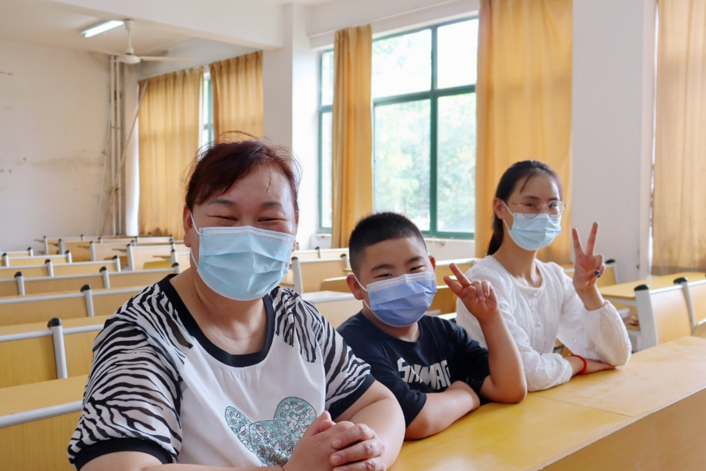 班晨灿的母亲坐在课桌前