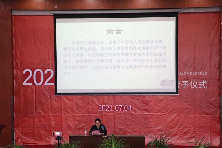 首先,家长代表孟淑云讲了什么是传统文化?中国传统文化是中华民族长期生活实践活动中的历史积淀,它与时代特征有机融合形成具有中国特色的民族精神,必然对当代大学生产生重要影响。