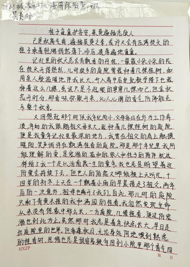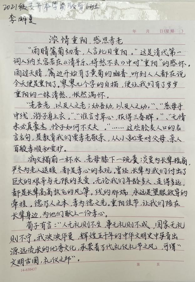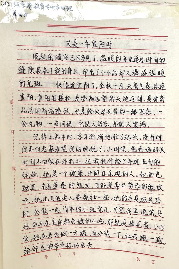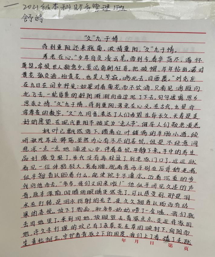 九九重阳节,浓浓敬老情。为弘扬中华民族敬老尊老的传统美德,引导同学们学会感恩,增强同学们的社会责任感。人文与管理学院于2021年10月14日举行以“浓情重阳,感恩孝老”为主题的征文比赛。此次征文比赛在知勤庭四楼进行展览。