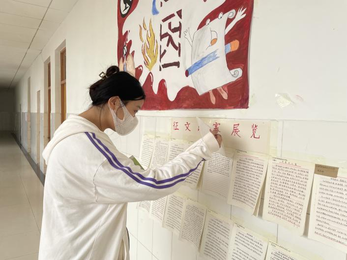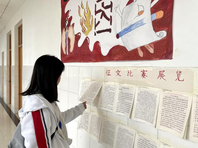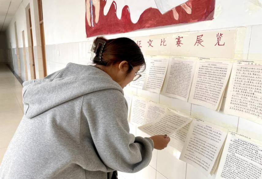 课间时,征文展览引来了许多同学观看。吸引同学们的不仅仅是重阳感恩孝老的主题,更多的是来自内心对老一前辈的敬重感,令他们驻足观望。