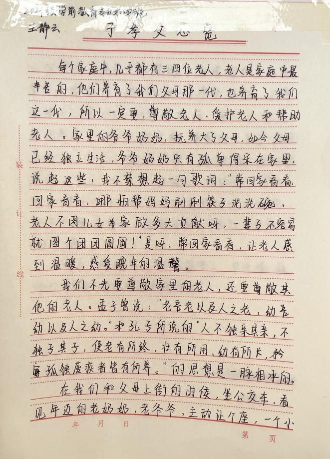 此次不仅仅是一次征文比赛,更传承和弘扬了孝亲敬老的中国传统文化、庆贺了重阳佳节,让同学们深入了解了丰富多彩的中华传统习俗。倡导孝亲文化,传承中华传统美德,为传统的民俗节日赋予新的内涵,让孝亲敬老成为全社会共同的责任。助老为乐,爱老为美,用爱心托起老年人幸福的晚年。