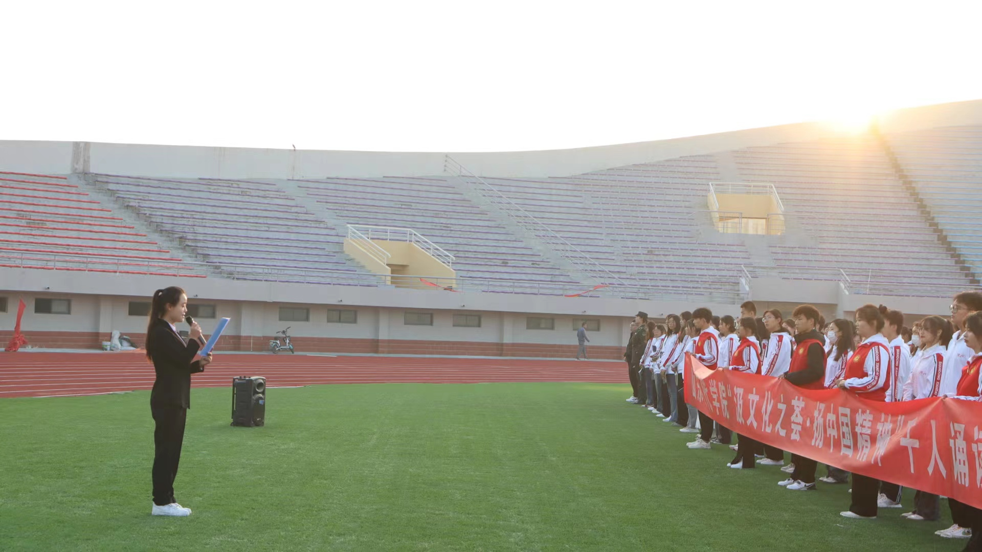 为进一步推进校风学风建设,建设“书香校园”,让诵读经典之风弥漫校园,引导学生读圣贤书,立君子品,做有德人,人文与管理学院于10月9日在新体育场举办“汲文化之荟,扬中国精神”千人诵读活动。