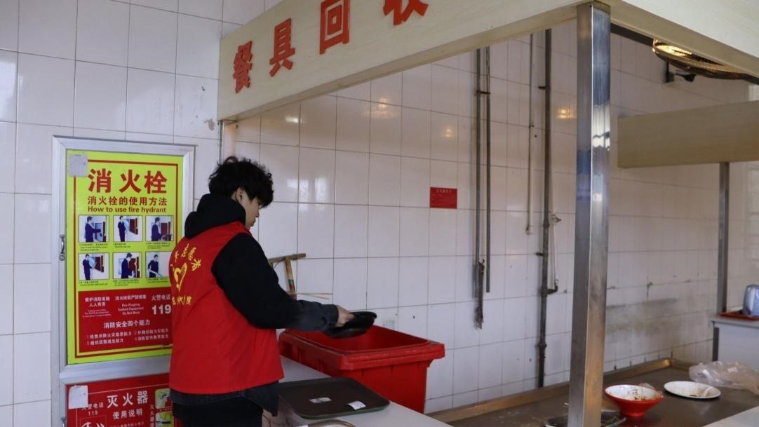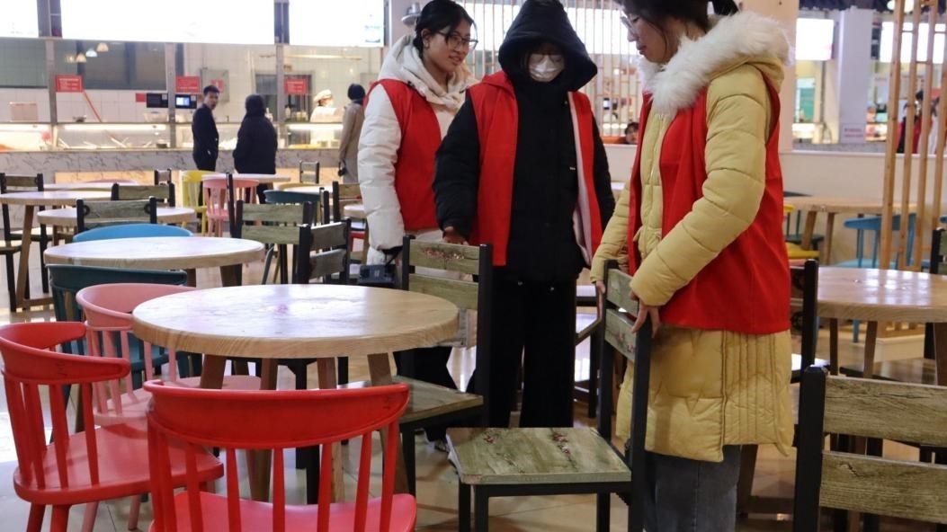 志愿者们采取分组的方式进行。一部分志愿者协助食堂清洁阿姨对餐桌上的残留物进行清理,在餐具回收处帮助工作人员回收餐具。一部分志愿者对桌椅进行整理、清扫地面,展现了现代学子的工作热情和责任感。