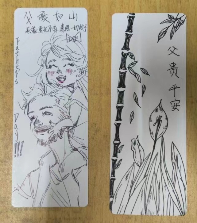 每一枚书签都凝聚了同学们的巧思和心血,成为传递爱意的独特载体。有的书签上绘制了父亲喜欢的图案,有的则写下了温馨的祝福语。
