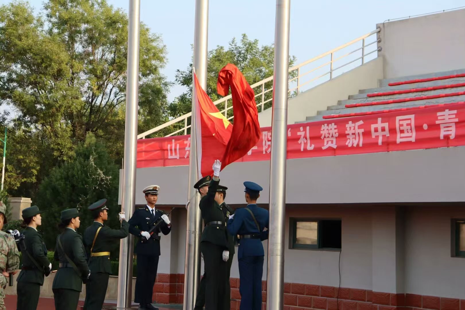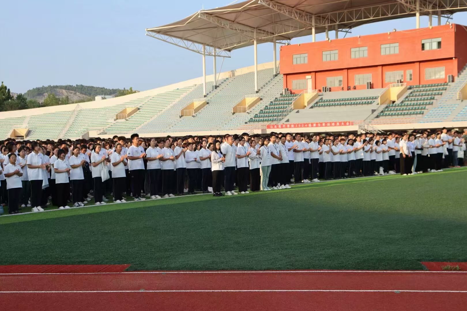 为弘扬爱国主义精神,鼓励同学们树立远大理想,山东现代学院人文与管理学院全体大一新生在天行健体育场,参与“礼赞新中国·青春续华章”为主题的新学期首次升旗仪式。
