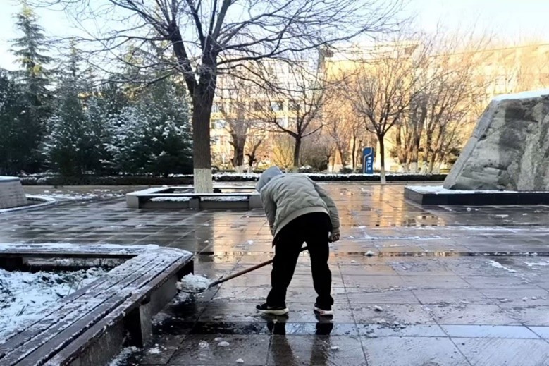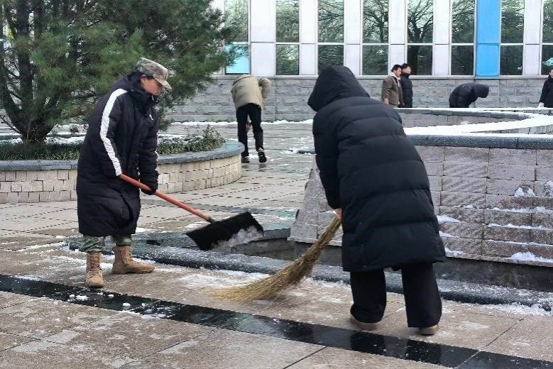 在学院领导和老师的带领下,志愿者们在博学楼下集合完毕。他们手持扫帚、铁锹等工具,纷纷开始除雪。他们分工明确,一部分人负责清扫路面上的积雪,一部分人则专攻结冰区域,用铲子一点点凿开冰层,确保道路畅通无阻。