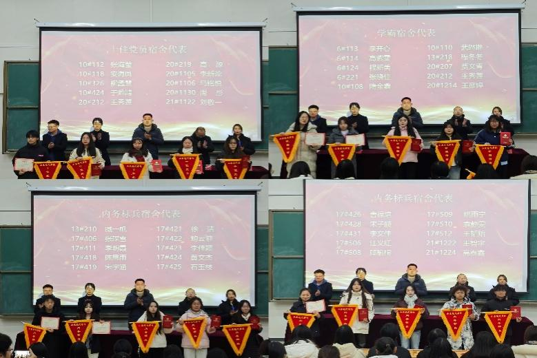 在热烈的掌声中,获奖宿舍代表逐一上台领奖,他们的脸上洋溢着自豪与喜悦。这些宿舍不仅在卫生内务方面整洁干净,更在团队协作、宿舍文化建设等方面展现了非凡的凝聚力和创造力。学校领导亲自为他们颁发荣誉证书和锦旗,并对他们的努力和付出表示高度赞扬。