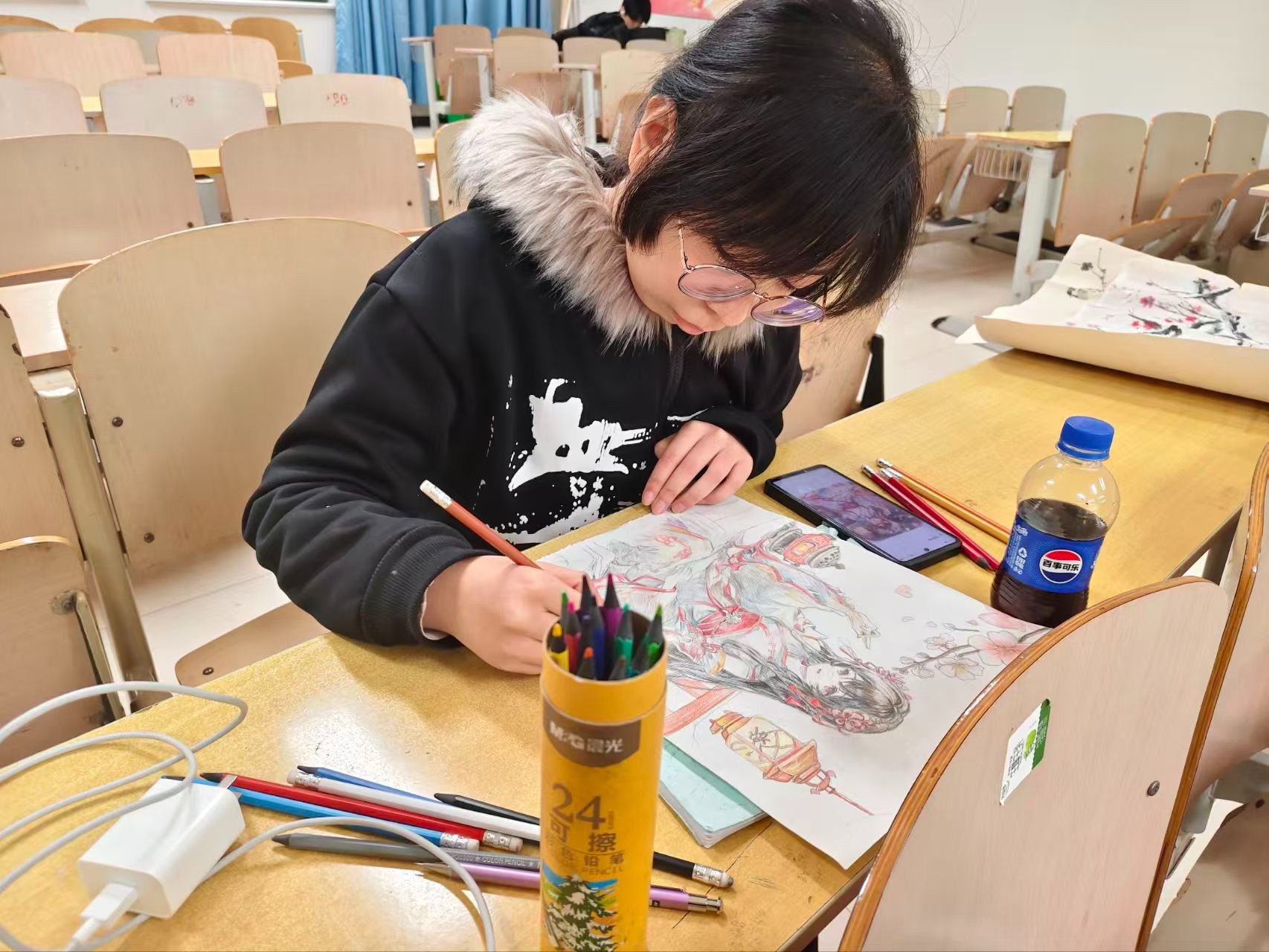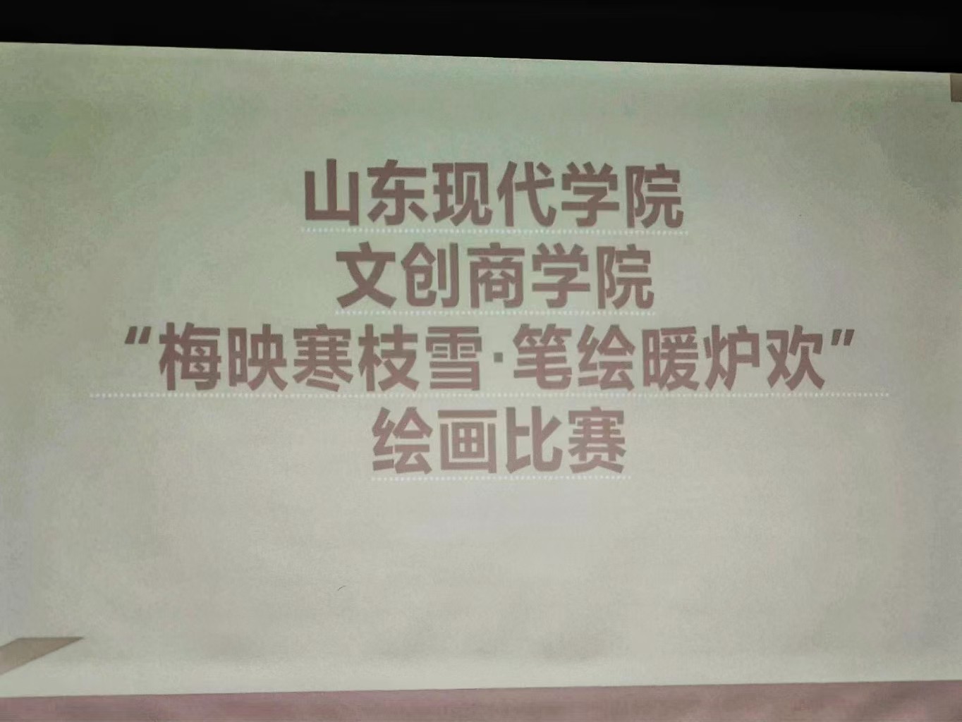 为深入贯彻落实党的二十大关于“推进文化自信自强,铸就社会主义文化新辉煌”的重要精神,进一步丰富校园文化生活,弘扬中华优秀传统文化,提升青年学生的审美素养与人文情怀,2025年12月8日,山东现代学院文创商学院在博学楼603教室成功举办“梅映寒枝雪·笔绘暖炉欢”主题绘画比赛。